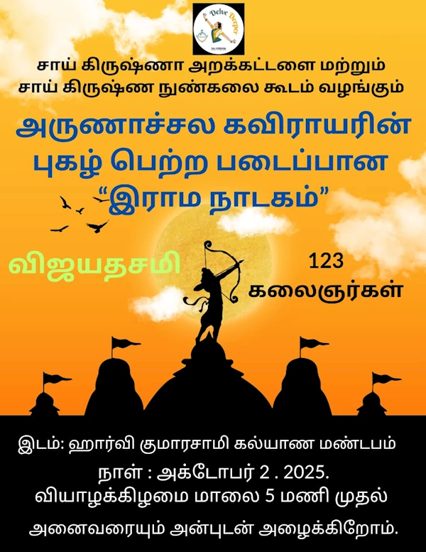 Arunachala Kavirayar's Magnum Opus The Rama Natakam Palace : Harvey Kumaraswamy Kalyana Mandapam, Tiruppur Day : Thursday Evening 5pm